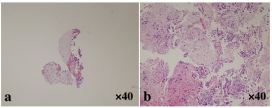 Comparison of histological sample volumes among various needles (a) A small amount of fragmented specimen obtained using 22-gauge FNA needles (H and E, ×40), which makes it difficult to diagnose adenocarcinoma. (b) A core tissue including the desmoplastic fibrosis with neoplastic cellular elements obtained using a 19-gauge FNB needle (H and E, ×40). This sample was obtained in sufficient quantity for genetic panel profiling testing for pancreatic cancer (OncoGuideTM NCC Oncopanel system, Sysmex Corporation, Hyogo, Japan).