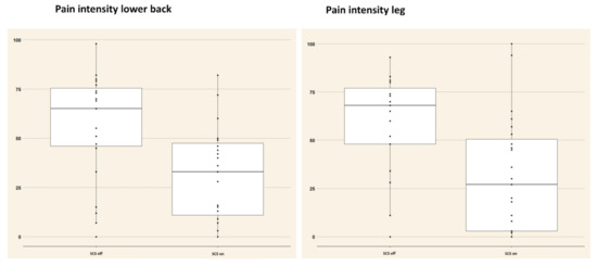 Boxplots showing individual observations of the pain intensity scores during SCS off and SCS on states for lower back (left) and leg pain (right). The first box presents the pain intensity scores during the SCS off state and the second box during the SCS on state. Abbreviations. OFF: SCS switched off; ON: SCS switched on; SCS: spinal cord stimulation.