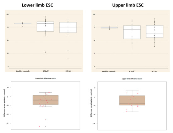 The median ESC values for healthy controls were 82.70 (Q1–Q3: 81.35–82.90) for the lower limb and 73.80 (Q1–Q3: 73.05–75.50) for the upper limb, based on the data produced by Vinik et al. (2016) [48]. For patients, the median ESC values during SCS on the painful side were 75 (Q1–Q3: 64.50–84.50) for the lower limb and 62.00 (Q1–Q3: 55.00–78.50) for the upper limb. The median differences in ESC between patients during SCS and matched controls were −8.00 (Q1–Q3: −18.00–2.55) at the lower limb and −13.80 (Q1–Q3: −18.45–2.90) at the upper limb. The median difference scores were significantly different from zero for the lower limb (95% CI from −14.70 to −2.00, p = 0.009) and upper limb (95% CI from −15.55 to −2.40, p = 0.01). Figure 2 presents ESC values for healthy controls, patients during both SCS conditions, and difference scores.