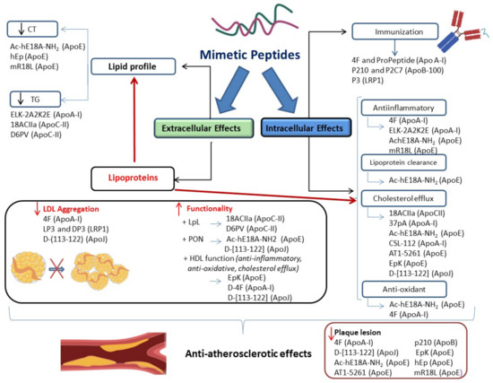 This is a comprehensive review focused on the use of peptides as anti-atherosclerotic tools. It integrates results from in vitro and in vivo studies, and clinical trials to summarize the potential applicability of these novel therapeutic tools. We hope to arise the interest of researchers and clinicians involved in the Atherosclerosis field. As shown in Figure 1, mimetic peptides exert a wide variety of beneficial effects, both extra- and intracellular. These effects include improvement of lipid and lipoprotein profiles and protection of LDL against modification. At the intracellular level, peptides exert anti-inflammatory, antioxidant, and anti-foam cell formation effects that result in atherosclerosis reduction. Mimetic peptides are promising therapeutic tools to target atherosclerosis because they cause low cytotoxicity and have low associated production costs; however, they still have to face many challenges in drug development and clinical trials.