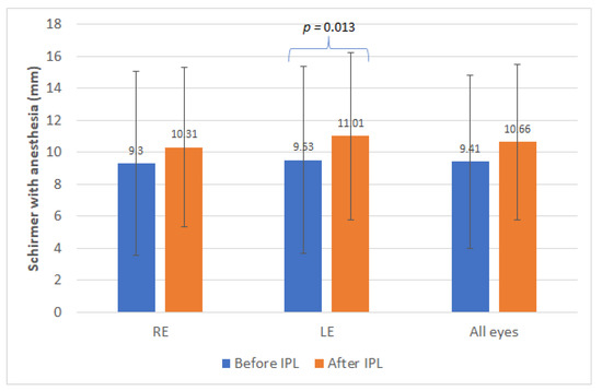 Mean values obtained with the Schirmer test with anesthesia before and after the treatment sessions. Statistical significant differences are displayed with the corresponding p-value. IPL: Intense pulsed light. RE, right eye; LE, left eye.