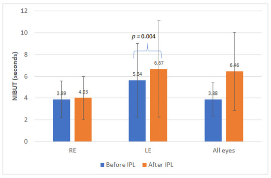 Table 1 summarizes the main clinical outcomes obtained in this clinical study in the different variables evaluated, considering all eyes (whole sample) and analyzing separately as well the data from right and left eyes. As shown, with the IPL treatment, only statistically significant improvements were found in the outcome of the Schirmer test with anesthesia measured in the left eye (LE) (p = 0.013, Wilcoxon test) (Figure 1). Concerning NIBUT measures, only a statistically significant increase in the value of the left eye was detected (p = 0.004, Wilcoxon tests) (Figure 2). Likewise, significant changes were found in the distribution of the results of the meibum quality (p < 0.001, chi-square test), with more eyes showing clear or yellow secretions after therapy.