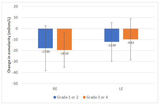 Significant changes were detected in tear film osmolarity in right eye (RE) (p < 0.001, Wilcoxon test) and LE (p < 0.001, Wilcoxon test), as well as when analyzing the whole sample of eyes (p < 0.001, Wilcoxon test) (Table 1). The mean change in tear osmolarity in RE and LE was −19.57 mOsm/L (median: −15.00, range: −110.00 to 25.00 mOsm/L) and −10.71 mOsm/L (median: −11.00; range: −47.00 to 41.00 mOsm/L), respectively. The change is osmolarity in RE correlated significantly with the baseline osmolarity (r = −0.636, p < 0.001, Spearman), as well as the change in osmolarity in LE with the osmolarity value before treatment (r = −0.620, p < 0.001, Spearman). In addition, there was a significant correlation of the change in osmolarity in the whole sample of eyes with the baseline osmolarity value (r = −0.585, p < 0.001, Spearman). This means that more reduction of osmolarity was present in those eyes with higher values of osmolarity at baseline. No significant differences in the reduction in osmolarity between those eyes with a baseline meibomian gland loss grade 1 or 2 and those with grade 3 or 4 were found (right eye, p = 0.565; left eye, p = 0.404) (Figure 3). Finally, a trend to more reduction of osmolarity in the whole sample of eyes was found in those cases with granular or solid meibomian secretions at baseline compared to those with clear or yellow secretions, but the difference did not reach statistical significance (−12.36 ± 14.43 vs. −20.56 ± 17.46, p = 0.063).