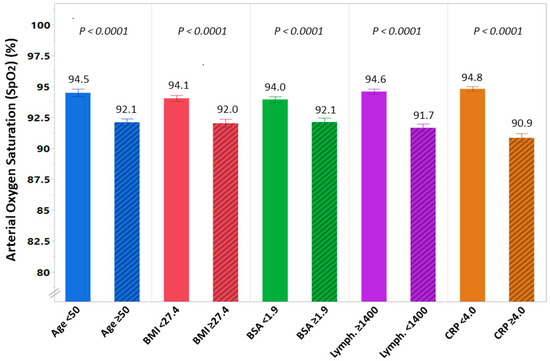 Differences in arterial oxygen saturation (SpO2) among patients hospitalized with COVID-19 stratified according to the independent predictors of low SpO2: age ≥ 50 vs. age < 50 years, high body mass index (BMI) (≥27.4 kg/m2) vs. low BMI (<27.4 kg/m2), high body surface area (BSA) (≥1.9 m2) vs. low BSA (<1.9 m2), low lymphocyte count (<1400 cells/μL) vs. high lymphocyte count (≥1400 cells/μL), and high c-reactive protein (CRP) (≥4.0 mg/dL) vs. low CRP (<4.0 mg/dL). SpO2 is presented in percentages.