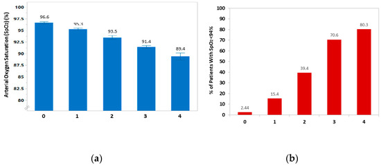 (a) Arterial oxygen saturation (SpO2) according to the number of risk factors (age ≥ 50 years, BMI ≥ 27.4 kg/m2, lymphocyte count <1400 cells/μL, and CRP ≥ 4.0 mg/dL) in each patient at the time of hospitalization with COVID-19. (b) The proportion of patients with SpO2 < 94% according to the number of these risk factors.