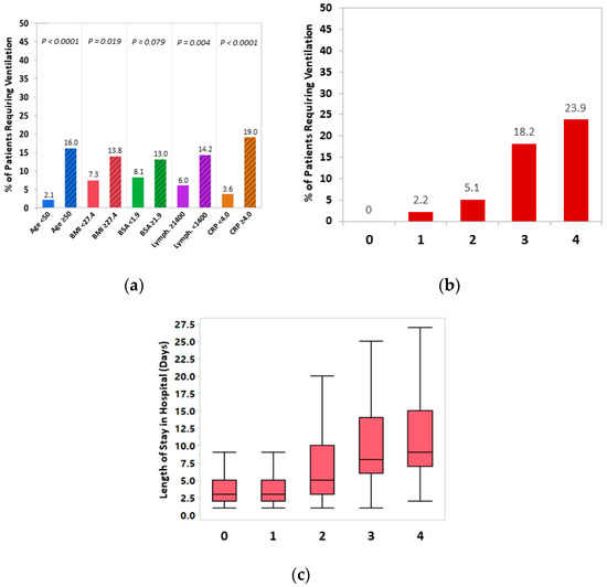 (a) Differences in the proportion of patients requiring in-hospital ventilation according to the risk factors identified for low SpO2 (age ≥ 50 years, BMI ≥ 27.4 kg/m2, lymphocyte count < 1400 cells/µL, and CRP ≥ 4 mg/dL). (b) Differences in the proportion of patients requiring in-hospital ventilation; and (c) differences in the length of stay (LOS) in hospital (presented in days) according to the number of these risk factors.
