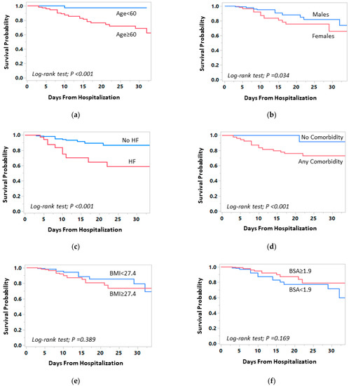 Kaplan–Meier curves for in-hospital mortality by demographic and clinical data comparing (a) adult patients 60 years or older and patients younger than 60 years, (b) females and males, (c) patients without and with underlying heart failure (HF), (d) patients without and with any comorbidity (defines as having ≥1 of the following: hypertension, diabetes mellitus, established cardiovascular disease, underlying HF, or chronic renal failure stage ≥4), (e) patients without and with high body mass index (BMI) (≥27.4 kg/m2), and (f) patients without and with high body surface area (BSA) (≥27.4 kg/m2).