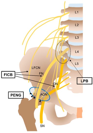 - Girón-Arango, L.; Peng, P.W.H.; Chin, K.J.; Brull, R.; Perlas, A. Pericapsular Nerve Group (PENG) Block for Hip Fracture. Reg. Anesth. Pain Med. 2018, 43, 859. [Google Scholar] [CrossRef] [PubMed]