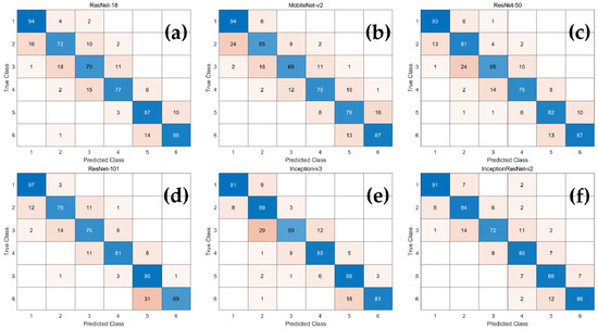 Accuracy, recall, precision, and F1-score were calculated using six multi-class confusion matrices (Figure 2) for each network. As demonstrated in Table 3, the average classification accuracy of all CNN-based deep learning models was over 90%. Among them, Inception-ResNet-v2 had relatively high accuracy, recall, precision, and F1-score, and those of MobileNet-v2 were low.