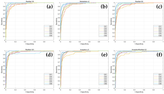 In addition, ROC curves were drawn for each CVM stage corresponding to each deep learning model, and AUC values were obtained (Figure 3 and Table 4). When comparing the AUC values for each CVM stage within the network, Inception-v3 had the highest AUC value for CS 6, and the remaining five networks demonstrated highest value of AUC for CS 1. In MobileNet-v2, CS 2 had the lowest AUC value, ResNet-101 had the lowest AUC value in CS 6, and in the remaining four networks, CS 3 had the lowest AUC value.