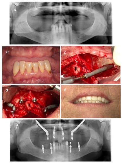 Representative figures of an All-on-4 Hybrid rehabilitation: (a) Pre-operative Orthopantomography; (b) Pre-operative intra-oral photograph in frontal view; (c) Insertion of NobelZygoma 0° implant through the Extramaxillary surgical technique; (d) Two NobelZygoma 0° implants inserted bilaterally in the posterior region with 45° Multi-unit abutments and two anterior NobelSpeedy Groovy implants with straight Multiunit abutments (All-on-4 Hybrid); (e) Immediate Provisional prosthesis loaded on the day of surgery; (f) Post-operative Orthopantomography.