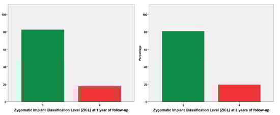 Zygomatic implant classification levels (ZICL) at 1- and 2-years of follow-up. The ZICL 1 level is considered the better prognostic considering the preventive aspect of a biological complication, with absence of MSEE > 4 mm, while a ZICL 4 is considered the worst prognostic level from a preventive point of view, with the presence of MSEE > 4 mm and simultaneous presence of plaque and bleeding. The sample was distributed along the two ZICL levels, with an increase of 1% in zygomatic implants with ZICL 4 level from the first to the second year of follow-up (18% to 19%).