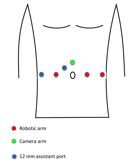 A minilaparotomy of almost 4 cm is performed 3 cm above the umbilicus, and the Alexis® wound retractor (Applied medical, Rancho Santa Margarita, CA, USA) is positioned [7]. After pneumoperitoneum induction (a 12 mmHg pressure is used for the entire procedure) the camera port is positioned through the wound retractor. All robotic arms are positioned on the same line at the level of the umbilicus. The first and second arms are positioned at 10 cm from the camera port, respectively, on the right and on the left side relative to the umbilicus. The third arm is positioned 10 cm laterally to the second arm. Two 12 mm assistant ports are positioned, one between camera port and first robotic arm and the other 10 cm laterally to the first robotic arm on the same line (Figure 1).