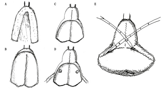 Shell neobladder reconstruction sketches. (A) Anastomosis between the urethra and the ileal tract identified for the future neobladder. (B) Configuration of the posterior plate. (C) Configuration of the neobladder neck. (D) Ureteral-neobladder anastomoses. (E) Configuration of the anterior plate.