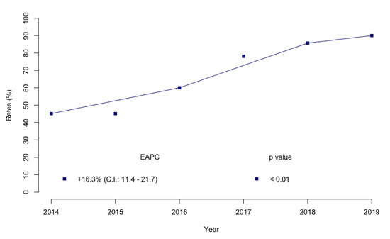 At our Institute, the annual rates of RARC with neobladder reconstruction (45.2–85.7%; estimated annual percentage change (EAPC): +16.3%; 95% confidence interval (CI): 11.4–21.7, p < 0.01) sharply increased from 2014 to 2019 (Figure 3).
