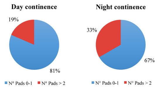 Daytime continence was achieved in 22 (73.3%) patients, while night-time continence in 18 (60%). However, when patients with incomplete data were removed, daytime continence rate rose to 81%, and the night-time continence rate similarly rose to 67% (Figure 4). At the time of the study, no patients needed self-catheterization.