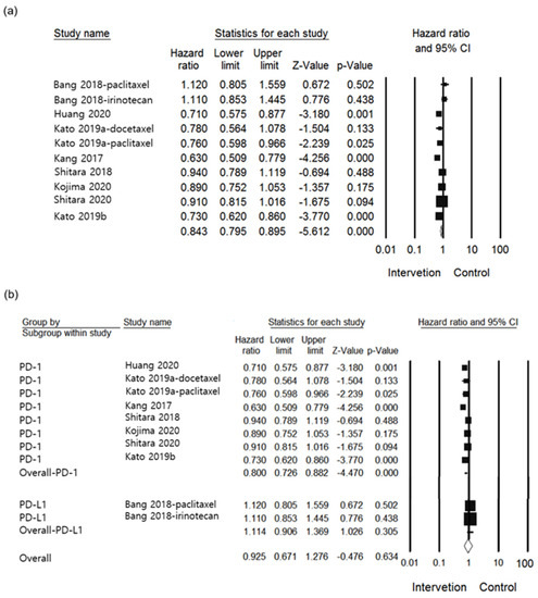 The present study had several limitations. Firstly, to compare efficacy, the OS, and the PFS, more studies need to be performed with each subgroup. A lack of studies may cause uncertain biases while interpreting results from the analyses [11]. However, recently, more studies in various settings have been performed, which could not meet the inclusion criteria of the current study. Thus, we expect that more updated information of OS or PFS relevant to using anti-PD-1 and PD-L1 will be provided by pivotal studies soon [4,28,46]. Secondly, the control groups of the included studies received different types of chemotherapies. Since different SOCs were indicated in clinical practice guidelines such as National Comprehensive Cancer Network (NCCN) guidelines depending on the patients’ status, various chemotherapies were dosed to the control groups in the included studies.