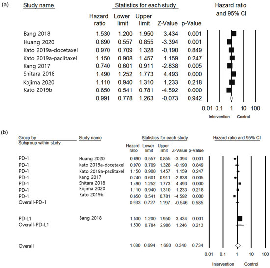 Esophageal or gastric/gastroesophageal junction (G/GEJ) cancer is one of the most fatal cancers [1,2]. Although these cancer types could not be together considered, controversies remain to differentiate esophageal or G/GEJ in terms of histological distinctions and clinical outcomes [3]. In addition, recently, a study was also conducted that examined esophageal and gastroesophageal junction cancer together [4]. Typically, esophageal or G/GEJ cancer is often asymptomatic in the early stages, resulting in a loss of opportunity for appropriate treatments in advanced cases. Still, recommended therapies primarily include surgical or systemic treatment such as platinum-based chemotherapy, the five-year survival rate remains around 15–25%, and high recurrence or metastasis rates have been reported [5]. Pathophysiologically, gastrointestinal tumors are traditionally considered non-immune-related malignancies. However, current reports have provided a new direction in the treatment by demonstrating the effectiveness of blocking specific immunosuppressive substances, such as programmed death receiver 1/programmed death ligand 1 (PD-1/PD-L1) [6]. Current studies have indicated that the number of tumor-infiltrating lymphocytes is related to tumor prognosis [7] and the correlation between malignant tumors and immune cells such as T cells. Thus, in order to enhance immune activity against cancer cells, PD-1/PD-L1 inhibitors have been developed. With regard to pathophysiological ensurance, various clinical studies have been conducted to provide empirical evidence for evaluating the effects of PD-1/PD-L1 inhibitors on esophageal or G/GEJ cancer—a cancer type with a low survival rate [6,8]. However, even the outcomes of systematic reviews and meta-analysis studies have not been able to provide conclusive information on the clinical benefits of PD-1/PD-L1 inhibitor usage for treatment of esophageal or G/GEJ cancer, as opposed to chemotherapies [6,8,9,10]. A meta-analysis conducted by Wang et al. [8] suggested that treating esophageal or G/GEJ cancer with PD-1/PD-L1 inhibitors resulted in a higher pooled hazard ratio (HR) for overall survival (OS) and progression-free survival (PFS), indicating their ineffectiveness. In contrast, Chen et al. [6] reported that PD-1/PD-L1 inhibitors were more effective than control therapy in the treatment of esophageal or G/GEJ cancer, demonstrating increased pooled odds ratios (ORs) for OS and PFS. Nonetheless, considering the limited number of studies conducted and inconsistencies in study designs in meta-analyses resulting in significantly heterogeneous results [6,8,9,10,11], more well-designed systematic studies—including randomized controlled trials (RCTs)—are necessary to further verify the efficacy and safety of PD-1/PD-L1 inhibitors in treating esophageal or G/GEJ cancer. Furthermore, as one of the standard methods in use for analyzing survival outcomes in oncology trials, HR in OS and PFS should be measured as endpoints in more statistically powerful studies [12]. Although currently a study demonstrated the efficacy of HR in OS and PFS in the treatment of PD-1/PD-L1 based on the regimen, only a network meta-analysis was available [13]. Since multiple indirect comparison trials are required to produce a sufficient level of power and precision as a single head-to-head trial [14], performing a future meta-analysis with head-to-head trials on the efficacy of anti-PD-1/PD-L1 for esophageal or G/GEJ cancer treatment is essential.