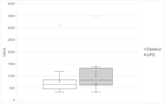 Data are presented as median (range). Statistical analysis was performed using SPSS (version 26.0 for Mac, IBM Corp., Armonk, NY, USA). Differences between groups were calculated by Mann–Whitney U-test. A two-way ANCOVA was conducted to examine differences in prolactin levels depending on gender and the two most common genetic factors in the study; paternal deletion and mUPD. In this analysis, age was entered as a covariate. Statistical significance was set at p < 0.05.