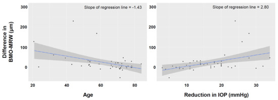 Univariable regression analysis found that the increase in the global BMO-MRW after trabeculectomy was greater when the patient’s age was lower, the CCT was thinner, the VF MD was better, the preoperative average RNFL thickness was greater, and the IOP reduction was higher (Table 3). Multivariable regression analyses found that younger age and greater reduction in the IOP after trabeculectomy remained significant factors that affected the increase in the BMO-MRW after trabeculectomy (Table 3, Figure 1). Unlike the BMO-MRW, the change in the average RNFL thickness was not affected by the patients’ age or the amount of reduction in IOP after trabeculectomy (Supplementary Table S1).