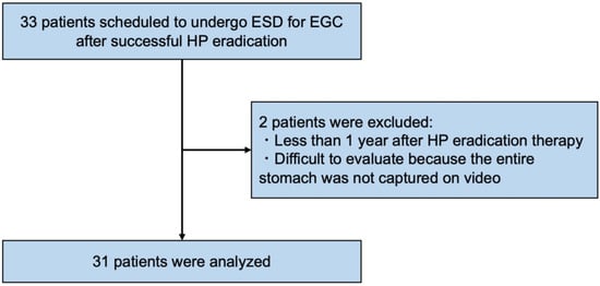 A total of 33 patients scheduled to undergo ESD for EGC after successful HP eradication in the four institutions were enrolled in this study. After enrollment in the study and video recording, two ineligible patients were excluded, and finally 31 patients (17 males, 14 females; mean age 72.1 years old) were evaluated in this study (Figure 2).