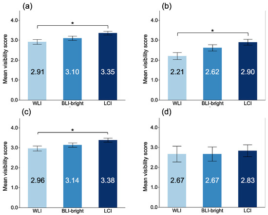 Mean visibility score of EGC among each modality in non-magnifying observation. (a) all EGCs; (b) EGC surrounded by map-like redness; (c) differentiated adenocarcinoma; (d) undifferentiated adenocarcinoma. *: p < 0.05.