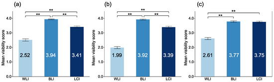 Mean visibility scores of EGC among modalities at magnifying observation. (a) microsurface at magnifying observation; (b) microvasculature at magnifying observation; (c) demarcation line at magnifying observation. **: p < 0.01.