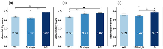 Mean visibility score of gastric mucosal findings among each modality. (a) atrophic border; (b) intestinal metaplasia; (c) map-like redness. *: p < 0.05, **: p < 0.01.