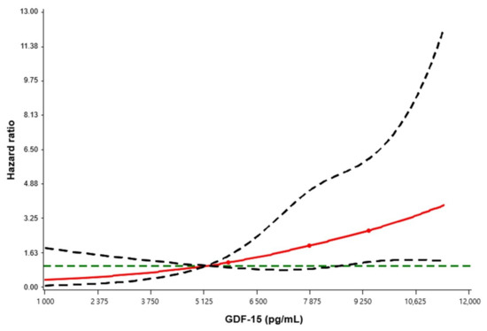 Association between GDF-15 concentration and in-hospital mortality hazard ratio by restricted cubic spline regression model. The reference value is the median of the first tertile (5187.3 pg/mL). The red line indicates the estimated hazard ratio; the dashed green line indicates the reference line of null hypothesis that the hazard ratio is 1; the dashed black lines indicate the lower and upper 95% confidence limits. Abbreviation: GDF-15, growth differentiation factor-15.