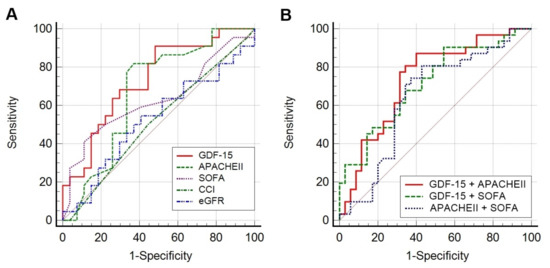 Serum GDF-15 concentration at the time of CRRT showed better performance in predicting in-hospital mortality among critically ill AKI patients compared to conventional scoring systems. Both APACHE II and SOFA scores are representative predictors for mortality in ICU patients. Many studies have demonstrated the accurate predictive power of these scores for mortality in critically ill patients [67,68,69,70]. However, severe AKI commonly causes electrolyte imbalances and fluid imbalances, making these scores difficult in predicting mortality in critically ill AKI patients [13,14,15]. Our study demonstrated that GDF-15 had a practical predictive value for mortality even as a single factor. Furthermore, the combination of GDF-15 with conventional severity scores, such as APACHE II score or SOFA score provides additional predictability. Even when added to the combination model of APACHE II and SOFA scores, predictive power was improved. Therefore, serum GDF-15, combined with the traditional risk scoring systems, can be used as a useful biomarker to increase predictive performance.