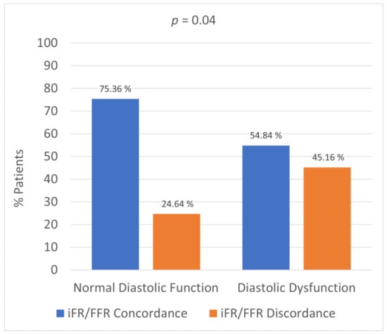 Patients’ charts were reviewed to gather clinical history, demographic data, angiographic details, and iFR/FFR measurements. Echocardiograms were reviewed by two independent reviewers for assessment of diastolic dysfunction and its grading. Kolmogorov–Smirnov normality test was used to analyze the normal distribution of the data. Mean ± SD was used to express continuous variables, while proportion and percentages were used to express categorical variables. For continuous variables, an unpaired t-test was used to assess the statistical difference between the two groups. For categorical variables, the chi-squared test was used to assess the statistical difference. Multivariable logistic regression analysis was used to evaluate the association of various echocardiographic parameters of diastolic dysfunction with iFR/FFR discordance. Statistical significance was indicated by a two-tailed p-value of less than 0.05. Statistical analysis was performed using Graph Pad Prism (GraphPad Software Inc., San Diego, CA, USA), version 9.