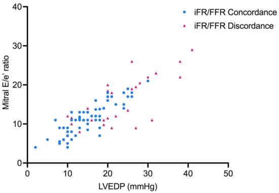 Scatter plot showing correlation between LVEDP and mitral E/e ratio in patients with iFR/FFR concordance and discordance. iFR: instantaneous wave-free ratio; FFR: fractional flow reserve; LVEDP: left ventricular end diastolic pressure.