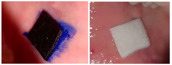 Carrier with methylene blue (left) and triamcinolone acetonide (right) cut to the lesion size and applied on the mucosa.