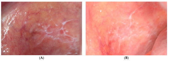 Oral lichen planus before (A) and after (B) photodynamic therapy.