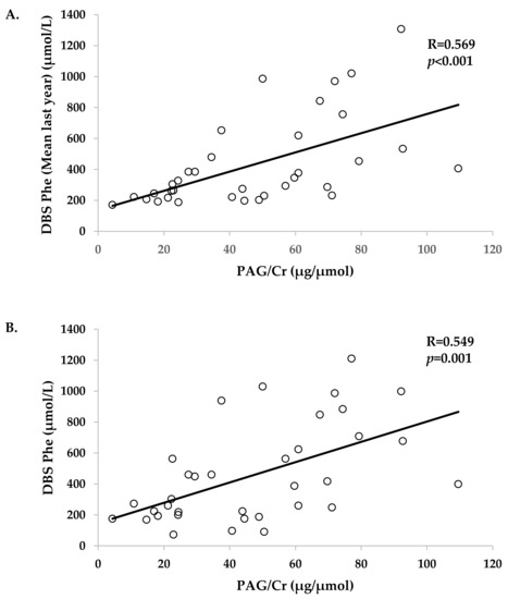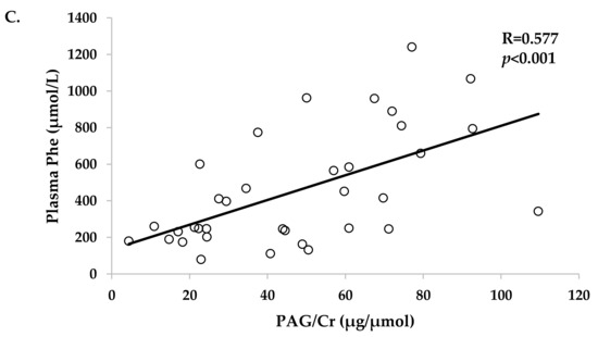 | Urine PAG/Cr (µg/µmol) | R = 0.569; | R = 0.549; | R = 0.577; | R = −0.055; | R = 0.287; | R = 0.187; |