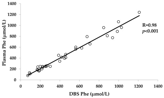 3.4. Correlation between Phe Levels in DBS and Plasma Samples