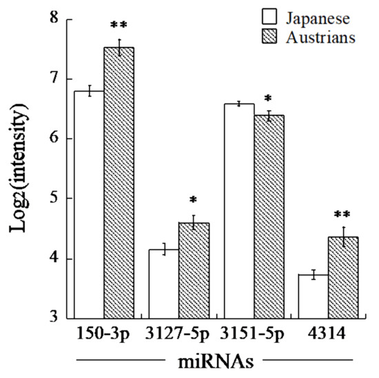 Comparison of miRNA levels in serum of Austrian and Japanese men. Shown are means of log2-transformed levels of each miRNA with their standard errors. Asterisks denote significant differences from the levels of Japanese (*, q < 0.01; **, q < 0.001).