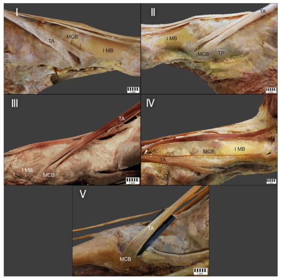 Tibialis anterior tendon. Classification by Olewnik et al. TA tibialis anterior, MCB medial cuneiform bone, I MB first metatarsal bone. (Type I—left foot; Type II, III, IV, V—right foot). Type I—the tendon splits into two equal-size bands that insert to the medial cuneiform bone and base of the first metatarsal. Type II—the tendon splits into two bands that insert to the medial cuneiform bone (larger component) and the base of the first metatarsal (smaller component). Type III—the tendon splits into two bands that insert to the medial cuneiform bone (smaller component) and base of the first metatarsal (larger component). Type IV—the tendon trifurcates, inserting to the medial cuneiform bone (one band) and the first metatarsal (two bands, to the base and the shaft /distal part). Type V—a single band inserts to the medial cuneiform bone.