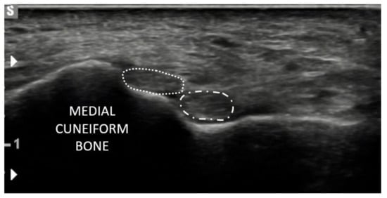 Summing up the most recent classification by Olewnik et al. [12] (which we will refer to in the next section of this overview), we can divide the morphological variations into six types. Type I is characterised by two insertions of equal size located on the medial cuneiform and the first metatarsal. Type II is represented by two bands, the wider one inserted on the medial cuneiform and the narrower one on the base of the first metatarsal; this was the most common type in the subjects in the sonographic study. Type III was characterised by the tendinous portion splitting into two ligaments, one inserted at the medial cuneiform (smaller portion) and the other at the base of the first metatarsal (larger portion). As mentioned above, type IV was only observed in the anatomical part of this study; no sonographically examined specimen showed this type. It was characterised by three tendons, one of which attached distally to the medial cuneiform bone, the other two to the base and shaft of the first metatarsal. Type V was characterised by a single ligament attached to the medial cuneiform bone, and this was the most common type among the dissected cadavers. The presence of Type VI was only detected on ultrasound examination; it consisted of two equal-sized ligaments, both attached to the medial cuneiform bone. All anatomical types identified by Olewnik et al. [12] are shown in Figure 1, and the USG type (VI) in Figure 2.