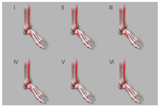 Classification by Karauda et al. [13]. Type I—the tendon splits into two equal-size bands that insert onto the medial cuneiform bone and base of the first metatarsal 1. Type II—the tendon splits into two bands that insert onto the medial cuneiform bone (larger component) and the base of the first metatarsal (smaller component). Type III—the tendon splits into two bands that insert onto the medial cuneiform bone (smaller component) and the base of the first metatarsal (larger component). Type IV—the tendon trifurcates, inserting to the medial cuneiform bone (one band) and the first metatarsal (two bands—to the base and the shaft /distal part). Type V—a single band inserts onto the medial cuneiform bone. Type VI—the tendon splits into three bands, onto the medial cuneiform bone (the smallest component) and base of the first metatarsal (the middle and larger components).