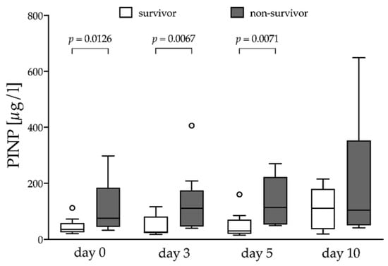 N-terminal procollagen I-peptide. Survivor vs. non-survivor, box plots using the Tukey method; PINP, N-terminal procollagen I-peptide. Outliers are marked as circles.