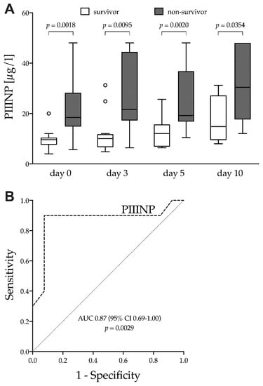 Non-survivors had higher PIIINP concentrations compared to survivors at the time of ECMO initiation (18.4 (14.8–28.2) vs. 9.6 (7.6–10.4) µg/L, p = 0.0018), on day 3 (21.6 (17.2–44.4) vs. 10.0 (6.6–11.8) µg/L, p = 0.0095), day 5 (19.2 (16.8–36.8) vs. 12.0 (6.8–15.6) µg/L, p = 0.002) and day 10 (30.4 (17.6–48.9) vs. 14.8 (9.4–27.2) µg/L, p = 0.0354) (Figure 2A). The logistical regression for PIIINP at the time of ECMO initiation yielded an OR of 1.37 (95% CI 1.10–1.89, p = 0.017) with an AUC of 0.87 (95% CI 0.69–1.00, p = 0.0029) (Figure 2B). The Brier score of the model was 0.121 with a LRT of 12.3 (p = 0.0005).