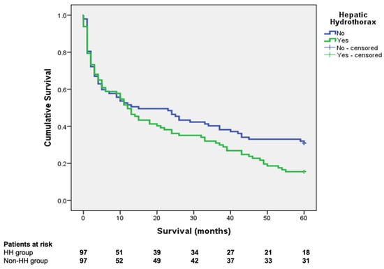 Regarding short- and mid-term mortality of patients with decompensated cirrhosis and HH, data from prospective studies are scarce. One aforementioned study [] reported 30-day, 90-day, and one-year mortality rates of 10%, 26%, and 57%, respectively. A large retrospective study conducted in Taiwan, which included 3487 cirrhotic patients with pleural effusions, reported 30-day, 90-day, 1-year, and 3-year mortality rates of 20.1%, 40.2%, 59.1%, and 75.9%, respectively []. However, in the latter study, data were collected using diagnostic and procedure codes from the electronic records, and it included only patients with pleural effusions requiring drainage, thus making an accurate diagnosis of hepatic hydrothorax without underlying or overlapping conditions rather difficult. Therefore, higher mortality rates might be explained by adding patients with more extensive collections (thus requiring drainage) and with more severe comorbidities (i.e., heart failure, pneumonia, empyema, or cancer).