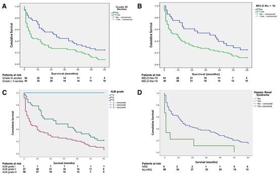 Based on these data, further subgroup analysis was performed on patients with HH (Figure 2). Consequently, patients with HH and grade III ascites had significantly worse survival when compared to patients with mild and moderate ascites, with a mean survival of 17.03 ± 2.88 months vs. 28.28 ± 3.38 months (log-rank < 0.01) (Figure 2A). Significantly different survival curves appeared when stratifying HH patients based on a MELD score of 16 (Figure 2B). Patients with scores exceeding this threshold had a mean survival of 18.56 ± 2.56 months, compared to 31.35 ± 4.27 for scores below 16 (log-rank 0.02). The survival gap increased along with the MELD-Na score, as exceeding a cut-off value of 20 has led to a mean survival of 12.88 ± 2.93 months, compared to 29.72 ± 2.98 months. Figure 2C depicts the survival curves based on ALBI grade, with the sole patient with ALBI grade 1 surviving the entire follow-up, patients with ALBI grade 2 (n = 37) having a mean survival of 26.56 ± 5.21 months, and ALBI grade 3 (n = 59) having a mean survival of 19.21 ± 3.21 months (log-rank 0.01). All patients with HH and HRS on the index presentation died during follow-up (n = 9), having a significantly worse survival (8.66 ± 5.53 months) compared to patients with no HRS, n = 88 (23.64 ± 2.41 months), as depicted in Figure 2D (log-rank 0.01).