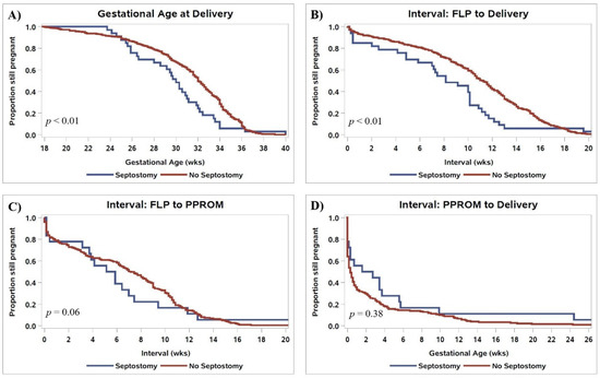 Kaplan–Meier curves comparing (A) gestational age of delivery, (B) the interval between FLP and delivery, (C) the interval from FLP to PPROM, and (D) the interval from PPROM to delivery in patients who had vs. did not have IOS. p-values are for log-rank tests comparing survival distributions.