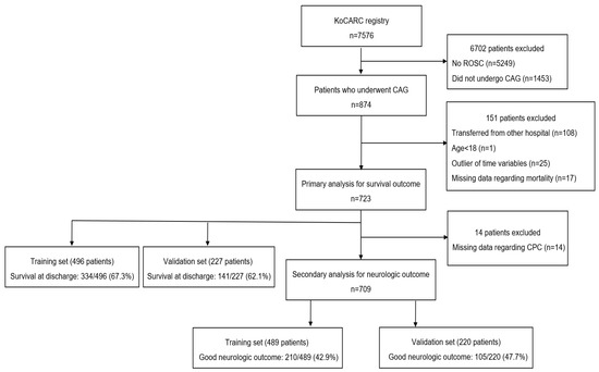 The study population was randomly allocated to either a training or validation set at a 7:3 ratio using the split sample validation method. In the training set, a univariate logistic regression analysis was performed to evaluate the prognostic ability of each variable for the primary and secondary outcomes. Then, a multivariable logistic regression analysis with variables with <20% missing data that had a p-value < 0.05 on the univariate binary logistic regression was performed. The variables that were identified as independently associated with survival or neurologic outcomes at hospital discharge were used to create the novel nomograms using the training data set. The performances of the nomograms were evaluated with respect to discrimination and calibration [14]. The predictive accuracies (discriminations) of the models were assessed using area under the receiver-operating characteristic curve (AUC) values and 95% confidence intervals (CIs), which quantify the level of concordance between the predicted probabilities and actual chance of the event of interest occurring. The accuracy of the novel nomograms was internally validated using the bootstrap method using resampling 1000 times of simple random sampling with replacement. The calibration of the nomograms represents how accurate the predicted probabilities are compared with the observed outcome frequencies using graphic representations (calibration curves). A curve along a 45-degree line indicates a perfect calibration model in which the predicted probabilities are identical to the actual outcomes. The calibration curves are presented as apparent and bias-corrected calibration plots using the bootstrapping methods with 500 re-samples. The predictive accuracy and calibration of the novel nomograms generated with the training set were subsequently tested in the validation set. In addition, to verify whether our novel nomogram would be applicable to the patients irrespective of the CAG findings, we performed the sensitivity analysis. According to the CAG findings, the group was divided into patients without actual lesions (normal coronary, insignificant lesion) and patients with actual lesions or decreased blood flow (notable stenosis, vasospasm). All reported p-values are two-sided, and statistical significance was set at p < 0.05.