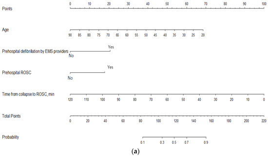 The time from collapse to ROSC was the most contributing variable in the nomograms predicting survival discharge and good neurologic outcomes at hospital discharge after CAG in patients with OHCA. The time from collapse to ROSC may be associated with ischemia. Cardiac ischemia and adenosine triphosphate depletion are believed to worsen over time after cardiac arrest [15]. Longer ischemic periods result in worsened neurological prognoses, and ultimately, increased probabilities of death. Therefore, the time from collapse to ROSC affects the severity of hypoxic-ischemic brain injuries and is one of the major causes of death after cardiac arrest [16,17]. Thus, the time from collapse to ROSC is an important factor for determining the benefits of CAG. Patient age and prehospital defibrillation by EMS providers are also common variables to both nomograms. Several previous studies have reported that a younger age and the use of automated external defibrillators at the scene are associated with better outcomes for patients with OHCA [18,19,20]. Patient age has more influence on the survival discharge in this study. Prehospital ROSC was included on the survival discharge nomogram and not on the neurologic outcome nomogram. A study conducted by David et al. reported that cardiac arrest survival is rare without prehospital ROSC [21]. Another study reported that patients with an initial shockable rhythm or EMS-witnessed arrest in the absence of field ROSC had a survival rate of 0.5% [22]. The results of these previous studies support the nomograms developed in this study.