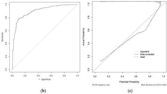 These three prognostic factors were included in the novel nomogram for predicting neurologic outcomes at hospital discharge. The time from collapse to ROSC was the most contributing factor in this nomogram (Figure 3a). The AUC of the nomogram was 0.9048 (95% CI: 0.8627–0.9469), and the internally validated AUC was 0.9070 (95% CI: 0.8554–0.9509). In the validation set, the discrimination of the nomogram was good, with an AUC of 0.8742 (95% CI: 0.8383–0.9101) (Figure 3b). The calibration plot of the nomogram demonstrated a good agreement in both sets (Figure 3c). The sensitivity analysis in patients with or without actual lesions showed that the AUC values of the novel nomogram were 0.8906 (95% CI: 0.8234–0.9579) and 0.9490 (95% CI: 0.8872–0.9999), which were not significantly different to that of the initial nomogram (p = 0.73 and p = 0.25, respectively).