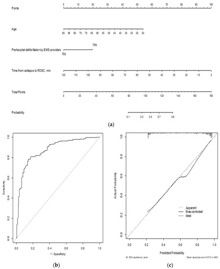 The training set for the neurologic outcome analyses included 489 patients, and the validation set included 220 patients. The baseline characteristics and variables found to be associated with favorable neurologic outcomes are summarized in Table 3. Patient age (p < 0.001), prehospital defibrillation by EMS providers (p < 0.001), and time from collapse to ROSC (p < 0.001) were identified as independent prognostic factors for neurologic outcomes (Table 2).