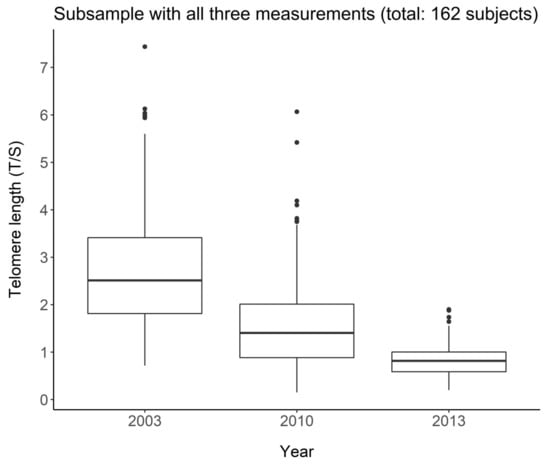 Considering the subgroup of n = 162 subjects with available three telomere measurements (in 2003, 2010, 2013), we used the Friedman test to compare the longitudinal distribution of the LTL at the three waves.